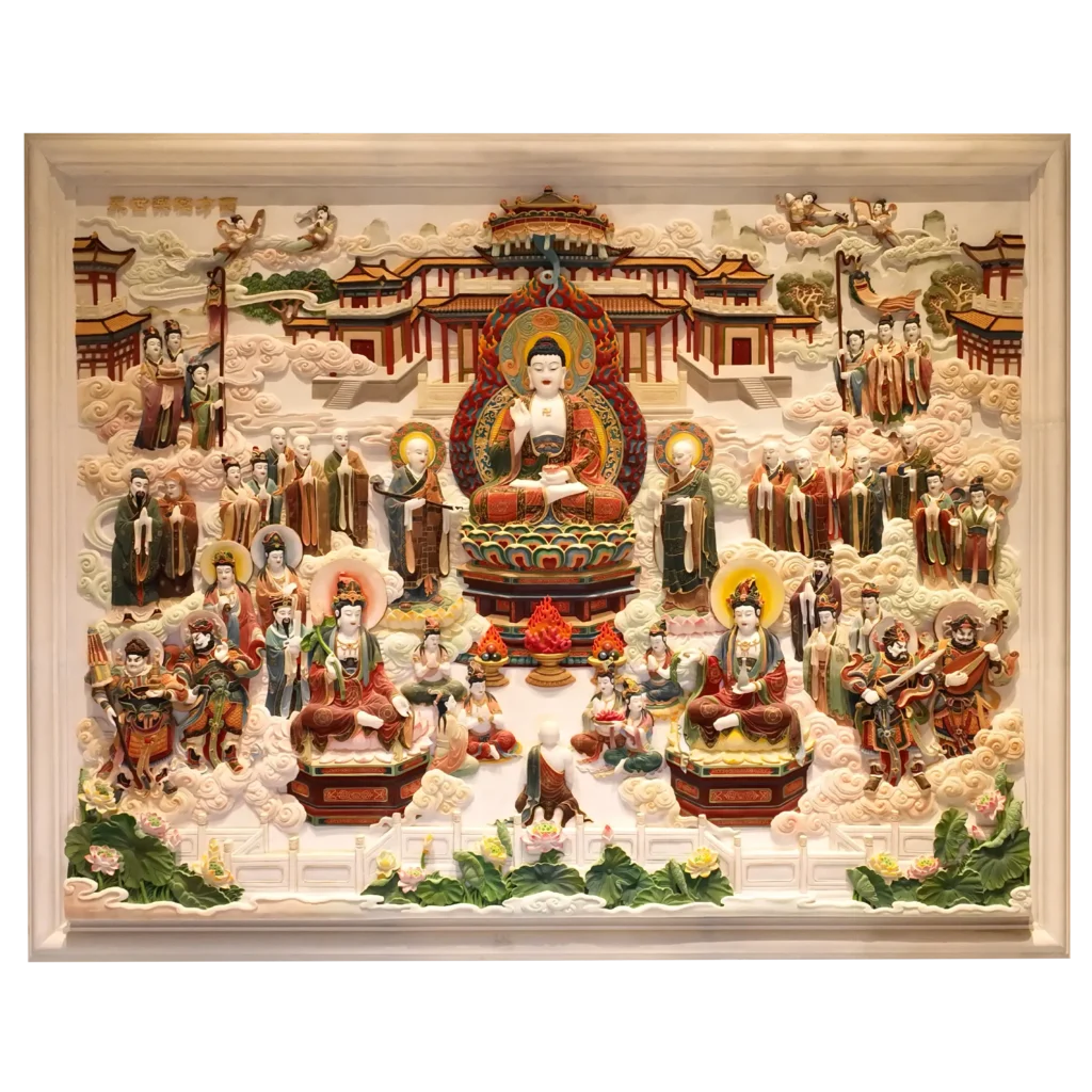 ภาพแสดงพระอมิตาภะประทับในแดนสุขาวดี รายล้อมด้วยพระอวโลกิเตศวรโพธิสัตว์ (กวนอิม) และพระมหาสถามปราปต์โพธิสัตว์ เรียกรวมว่า “พระอริยะแห่งสุขาวดี” สระบัวและปราสาทแก้วเป็นสัญลักษณ์แห่งความบริสุทธิ์และความสงบ ผู้ศรัทธาเชื่อว่าการสวด “นะโม อมิตาภพุทธายะ” ด้วยจิตเลื่อมใส จะได้รับการโปรดให้ไปเกิดในแดนสุขาวดี พ้นจากวัฏสงสาร