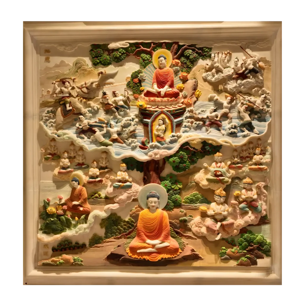 ฉากปราบมารสื่อถึงการเอาชนะกิเลส ความหลง และความยึดมั่นที่ขัดขวางการตื่นรู้ ส่วนภาพตรัสรู้แสดงพระพุทธองค์ในปางสมาธิ มีรัศมีแห่งปัญญาและเทพยดาเฝ้าสักการะ แสดงถึงการบรรลุญาณสูงสุดด้วยพระองค์เอง