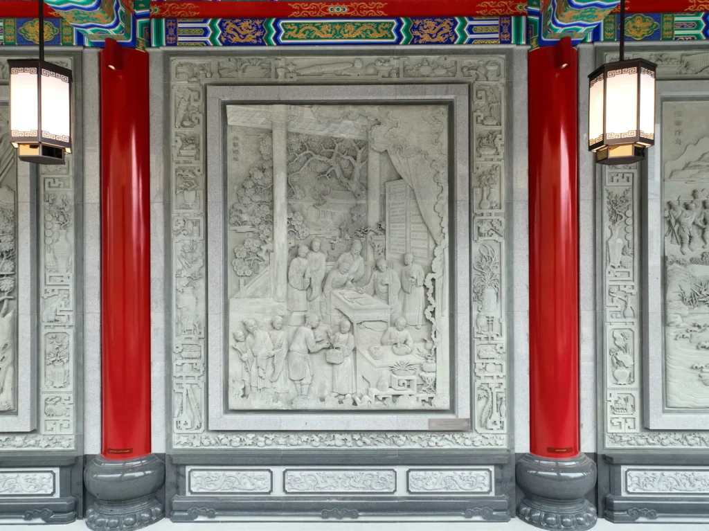 ภาพแสดงเรื่องราวหลวงปู่ไต้ฮงได้ตั้งศาลารักษาโรคที่ริมโขดหินใหญ่ จัดหาอาหารและสิ่งของให้ผู้ยากไร้ที่เดือดร้อน ชักชวนชาวบ้านและสานุศิษย์ให้ร่วมกันประกอบกิจกรรมกุศล จนชาวบ้านในอำเภอต่าง ๆ ประจักษ์ในบุญคุณครั้งนั้นทั่วกัน มีผู้คนจำนวนมากมาขอให้ท่านช่วยเหลือด้านต่าง ๆ จนต้องขยายศาลารักษาโรคและโรงทานเพื่อรองรับประชาชนจำนวนมาก
