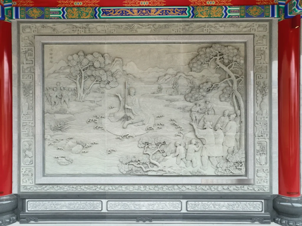 ภาพนี้แสดงให้เห็นเหตุการณ์อัศจรรย์ที่หลวงปู่ไต้ฮงใช้ร่มขนาดใหญ่เป็นเรือในการข้ามแม่น้ำที่เชี่ยวกราก เพื่อช่วยชีวิตผู้คนที่ติดอยู่อีกฝั่งหนึ่งของแม่น้ำ ภาพแสดงให้เห็นท่านกำลังนั่งบนร่มที่ลอยอยู่บนผิวน้ำ ขณะที่ชาวบ้านยืนมองด้วยความประหลาดใจและชื่นชม บรรยากาศแวดล้อมคือแม่น้ำที่กว้างใหญ่ ภูเขา และหมู่บ้านริมน้ำ