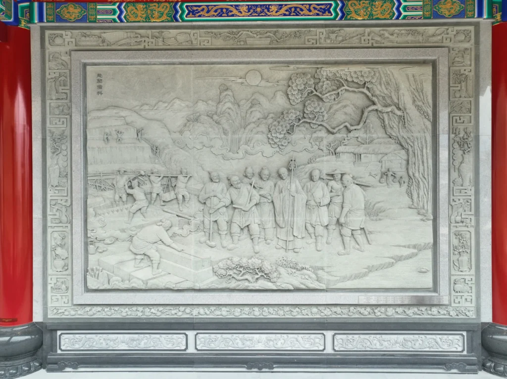 ภาพนี้แสดงให้เห็นหลวงปู่ไต้ฮงเดินทางไปยังมณฑลฮกเกี้ยนเพื่อเตรียมวัสดุสำหรับการสร้างสะพาน ท่านกำลังพิจารณาและคัดเลือกไม้คุณภาพดี พร้อมกับสนทนากับช่างฝีมือและผู้เชี่ยวชาญด้านการก่อสร้าง รอบ ๆ มีกลุ่มคนกำลังตรวจสอบไม้และวัสดุก่อสร้างชนิดต่าง ๆ บรรยากาศเต็มไปด้วยความคึกคักและการวางแผนงานอย่างรอบคอบ ทั้งนี้เพื่อให้มั่นใจว่าสะพานที่จะสร้างขึ้นจะแข็งแรงทนทานและปลอดภัยสำหรับผู้ใช้งาน